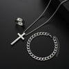 Transforme seu visual com o nosso conjunto de joias de aço inoxidável, projetado para homens que buscam estilo e atitude. Este conjunto único inclui um colar com pingente de cruz, um anel e uma pulseira, todos elaborados para destacar sua personalidade forte.